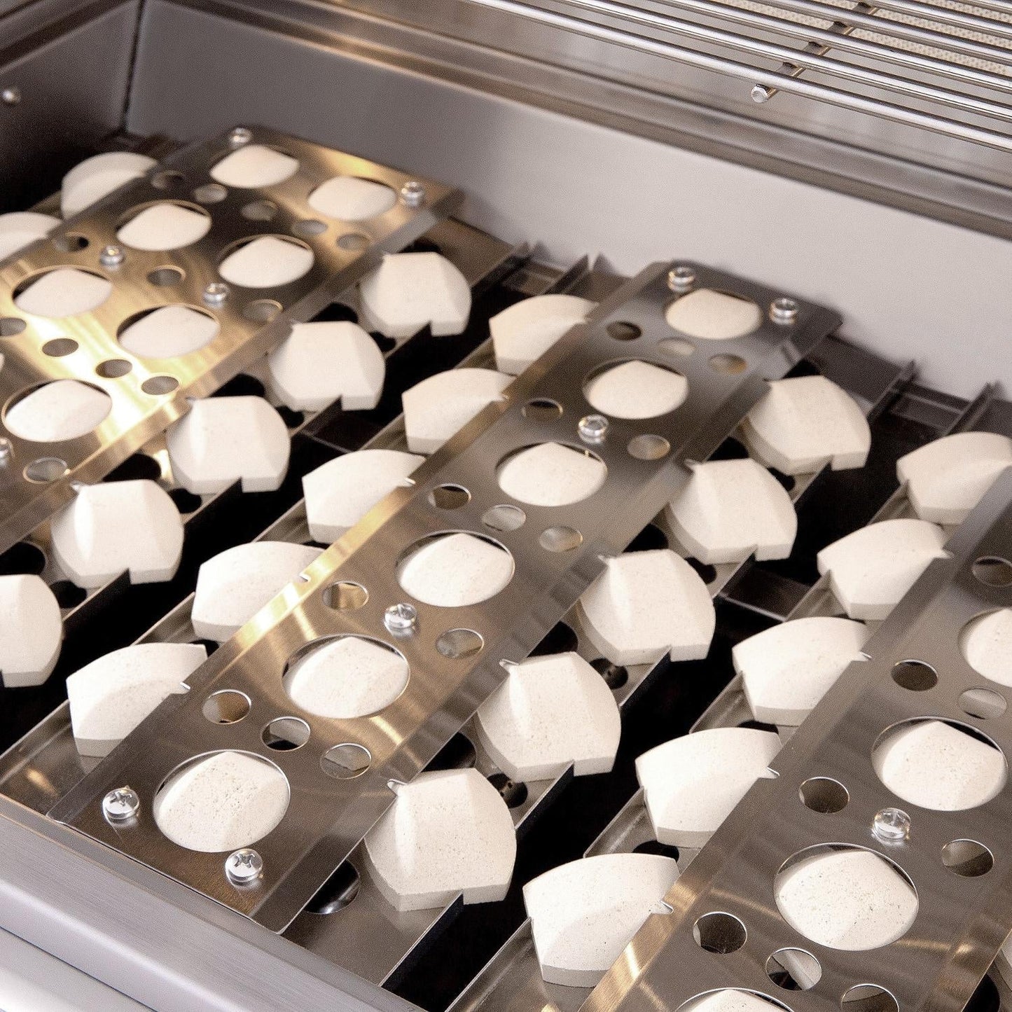 - Ceramic briquette trays minimize flare-ups and provide even heating