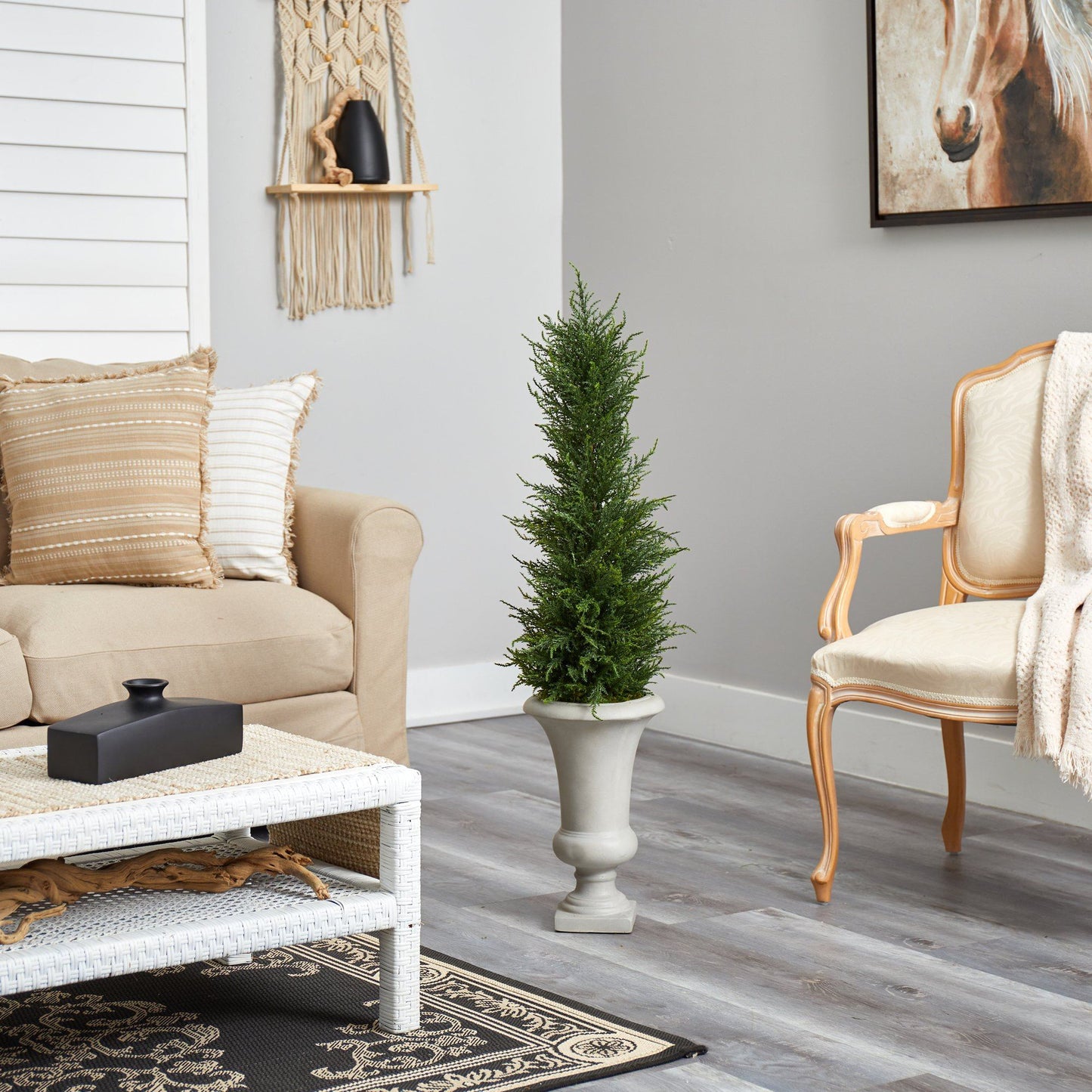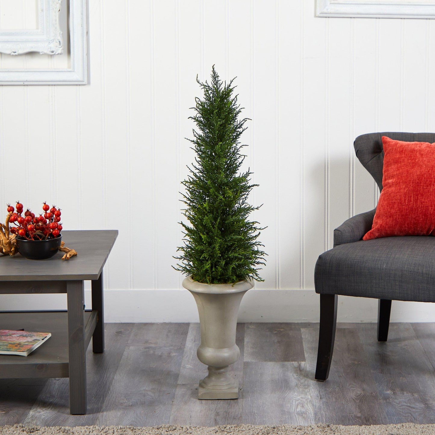 Transform your space into a cozy oasis with this Cypress Artificial Tree. Realistic, well-groomed fronds are shaped into an attractive elongated shape for a polished look. Compact and narrow in design, you can place safely in any indoor/outdoor space with its UV resistant feature. Standing 44" from a sand colored urn (included in height) bring the restaurant and European café look to your next dinner party. Place in your entryway, outdoor patio, or next to your sofa.