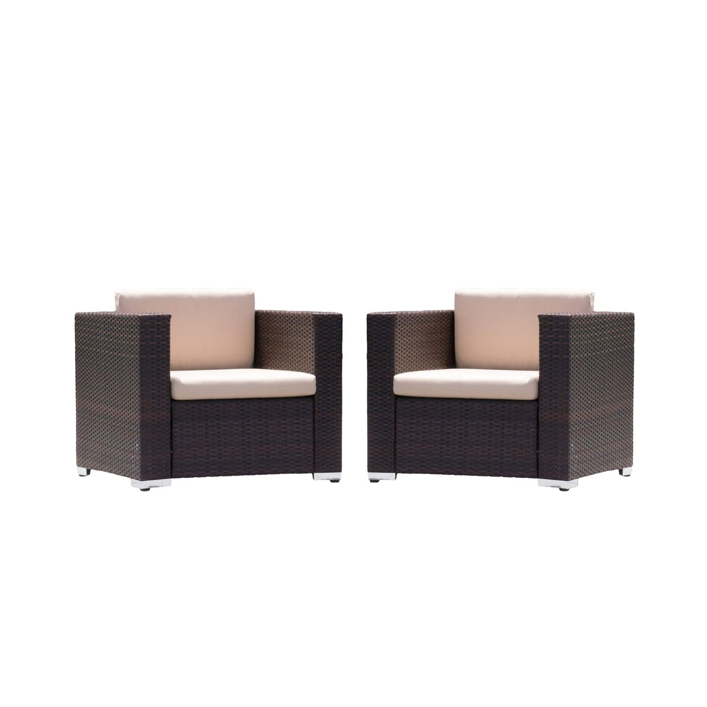 Transform your patio or garden into a haven of style and comfort with the Modern Rattan Outdoor Water-Resistant Wicker Patio Chairs. Thoughtfully designed for outdoor relaxation, this set of two chairs combines contemporary elegance with durability. Featuring a sophisticated brown multitone rattan weave and plush tan cushions, these chairs are perfect for entertaining guests or enjoying a peaceful coffee on a sunny morning. With water-resistant cushions and a robust metal frame, they’re built to withstand the elements while offering timeless charm and luxurious seating year-round. Sit back, relax, and elevate your outdoor living experience today!